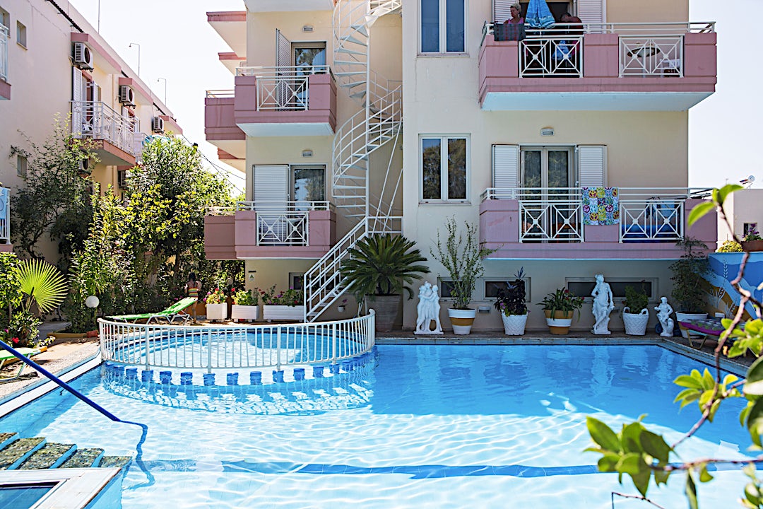 De ljusa lägenheterna är enkelt inredda och har olika storlek. Alla med rosa balkonger med vita smidesräcken.