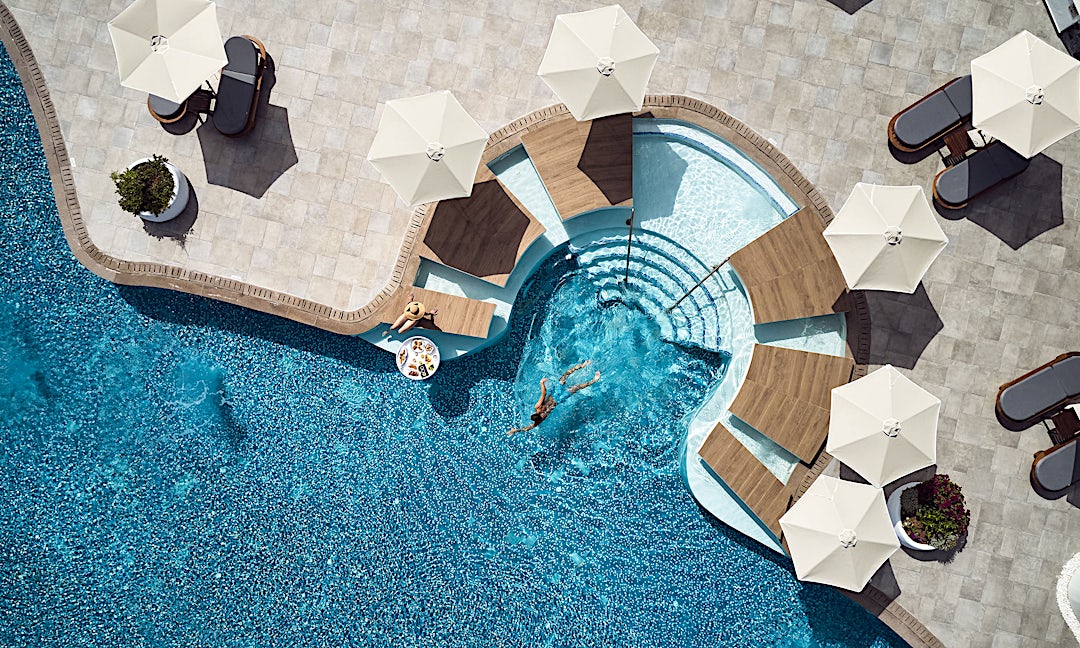 Vid sidan av den privata stranden ligger The Royal Blues två poolområden med utsikt över havet. Ett är endast för vuxna och för de allra minsta finns en grund liten plaskpool. Lek på land ordnas i hotellets barnklubb och för vuxna finns allt från pulshöjande träning till lugna spabesök i Pures Senses Spa som även har en uppvärmd inomhuspool.