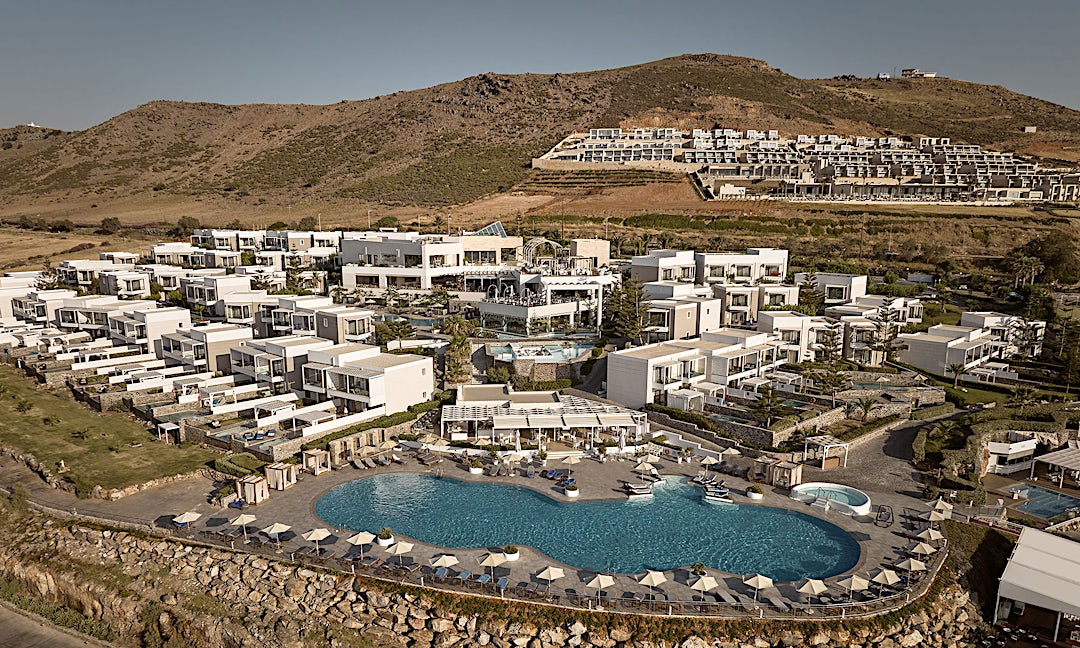Hotellet är stilrent med låga bungalowbyggnader på en liten höjd med utsikt över havet.