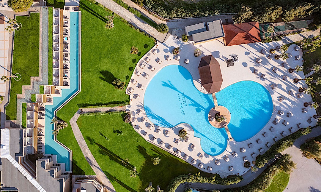 Kresten Palace ligger på en klippa i Kallithea med panoramautsikt mot havet. Här väntar allt från fitnesscenter till tennisbana och ett stort lagunformat poolområde. Du kan välja att boka rum med havsutsikt eller swim-up.