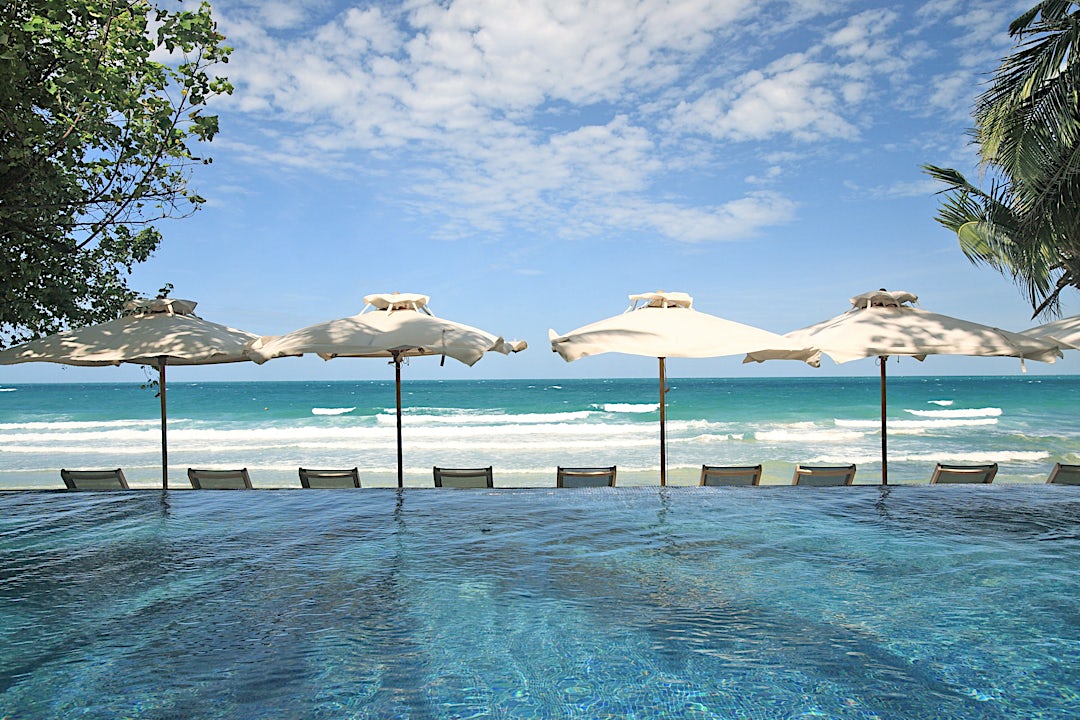 Hotellets lilla pool med soldäck av trä ligger alldeles vid stranden. Ovanför klättrar hotellet och bungalowerna längs med bergssluttningen i det tropiska djungellandskapet.