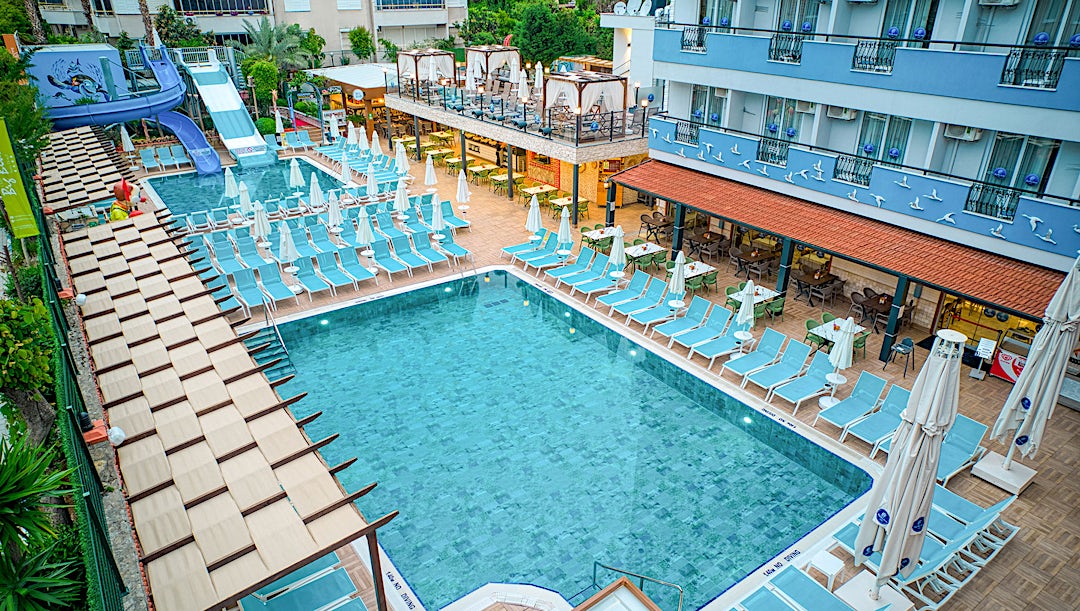 På familjevänliga Club Big Blue Suite Hotel bor du i östra Alanya, med gångavstånd till stranden där solsängar ingår för dig som gäst. All Inclusive med buffémåltider ingår och på hotellet finns två pooler, vattenrutschkanor och spa.